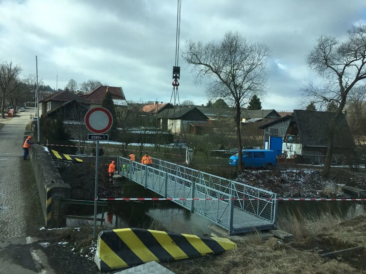 „Třítunovou lávku jsme usazovali na betonové panely na vzdálenost osmnáct metrů,“ upřesnil jeřábník PRETOLU Jaroslav Říha. Přes most, který je v současné chvíli opatřen betonovými bloky zamezujícími průjezd, stejně jako přes lávku, se dostanou pouze pěší, nikoli vozidla. Z důvodu špatného stavu pilířů mostu, který pochází z roku 1925, se letos plánuje jeho demolice a vystavení mostu nového. Výstavba nového mostu by měla trvat zhruba půl roku.