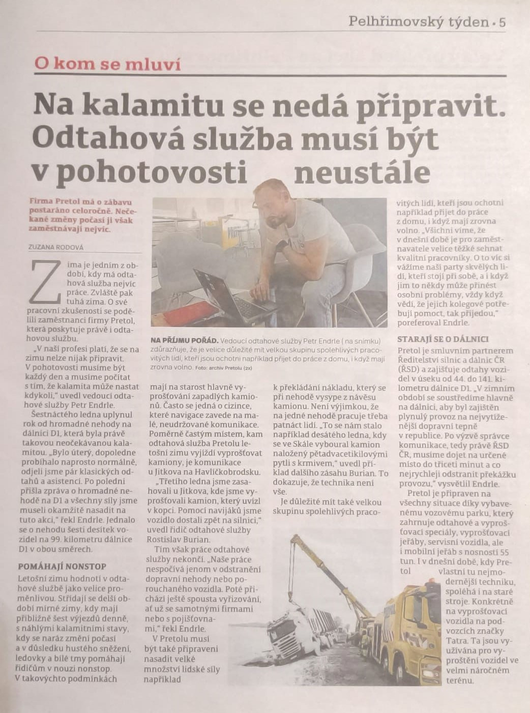 06.02.2019 jste si mohli v příloze Pelhřimovského deníku „Pelhřimovský týden“ přečíst článek o práci naší odtahové služby v zimním období. Pokud jste si noviny nestihli koupit, můžete si článek přečíst zde.