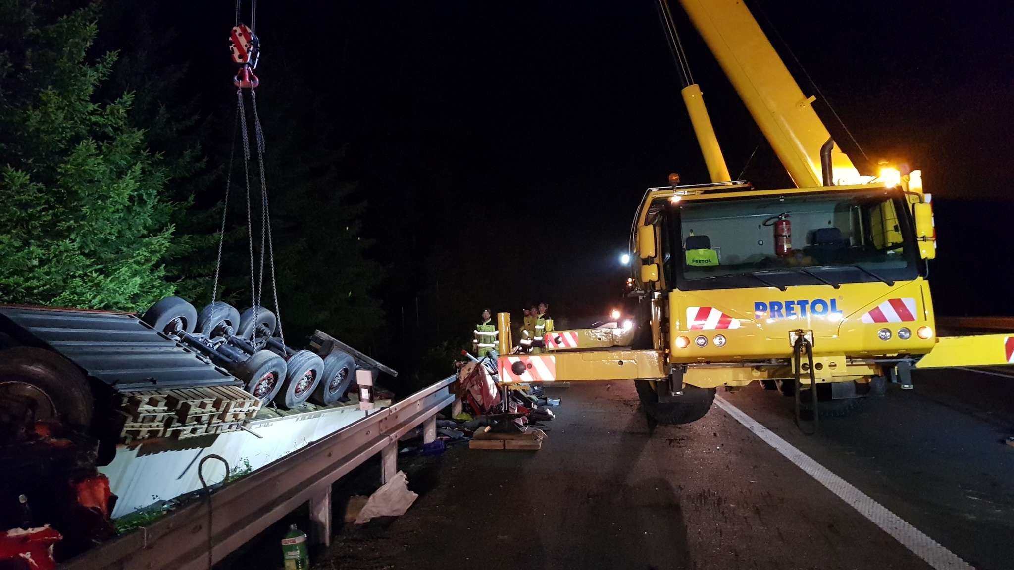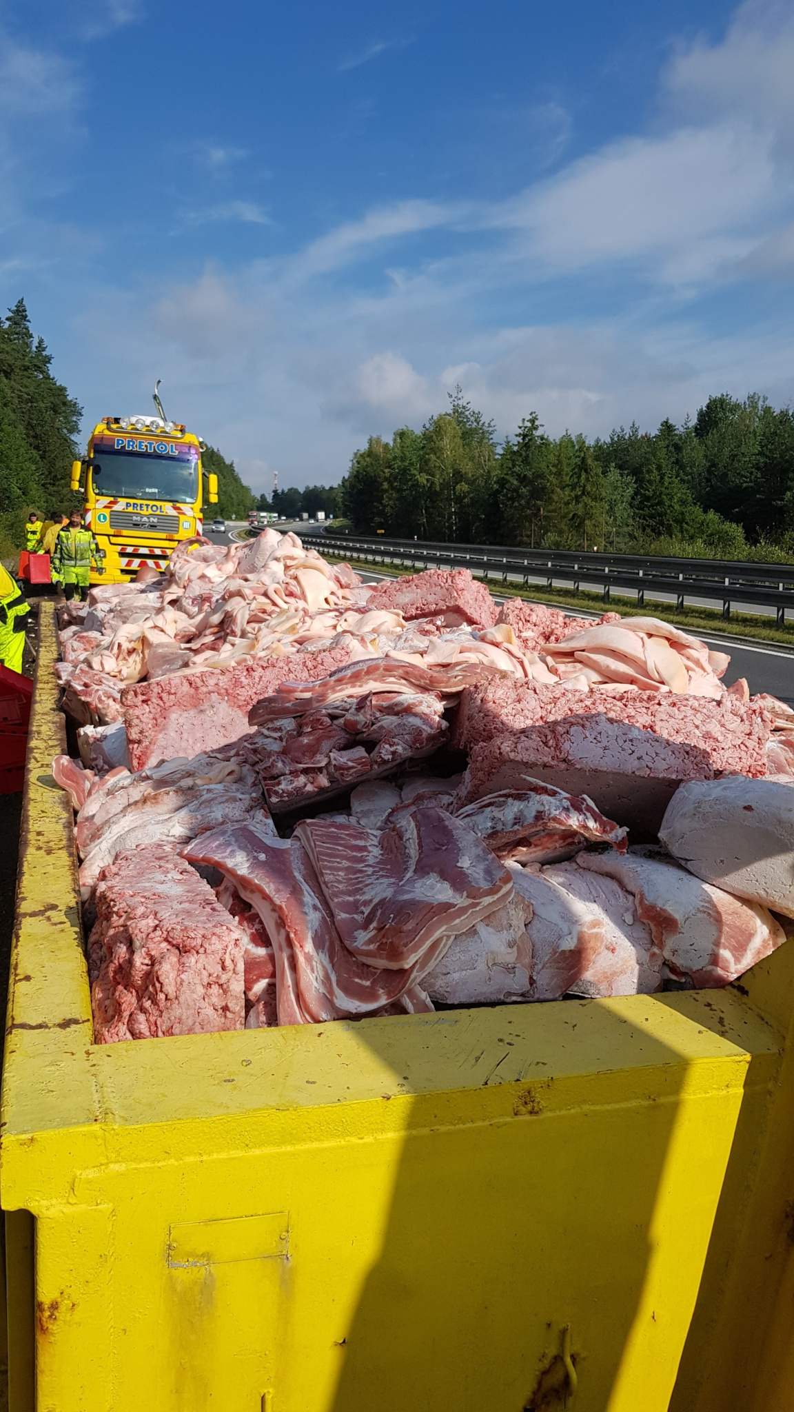 Nejnáročnějším zásahem roku 2019 byla nehoda kamionu, který převážel mražené maso. Ta se stala v noci z 16. na 17. července. Kamion ležel převrácený přímo na střechu ve hlubokém srázu vedle dálničního tělesa. Protože se jednalo o chladírenský návěs s pevnými, a po nehodě vypouklými, boky, nemohlo se z důvodu bezpečnosti pracovat uvnitř návěsu, jelikož mohlo dojít k jeho rozpadnutí. Běžným postupem je nejprve přeložení nákladu a následně vyproštění havarovaného vozidla, v tomto případě se však muselo k práci přistoupit opačně. Nejprve se musel jeřábem s 55tunovou nosností dostat návěs z hluboké škarpy a maso, které pod srázem zůstalo, museli následně zaměstnanci PRETOLU vynášet do kontejnerů stojících na silnici. „Jednalo se o jednotlivé balíčky zmraženého masa a kromě toho také o separáty, které se doslova rozpadaly v rukách. Asi si dokážete představit, jak to mohlo vypadat, když ráno začalo svítit Slunce,“ řekl k nehodě řidič odtahové služby Jaroslav Tvrdý.