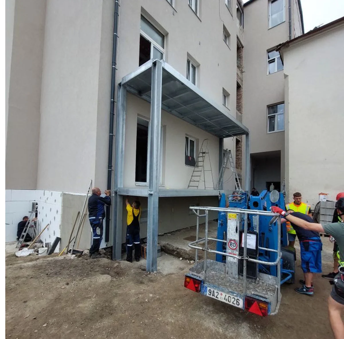 Konkrétně se jednalo o vytvoření čtyř balkonů na míru pro rekonstruovaný bytový dům v Kutné Hoře. Jednotlivé balkony se pyšní rozměry 1660 x 6850 mm, jsou posazené na opěrných nohách o celkové výšce 13 000 mm a každý balkon je osazen zábradlím. A jak se nám tato práce povedla, se můžete přesvědčit na fotografiích.